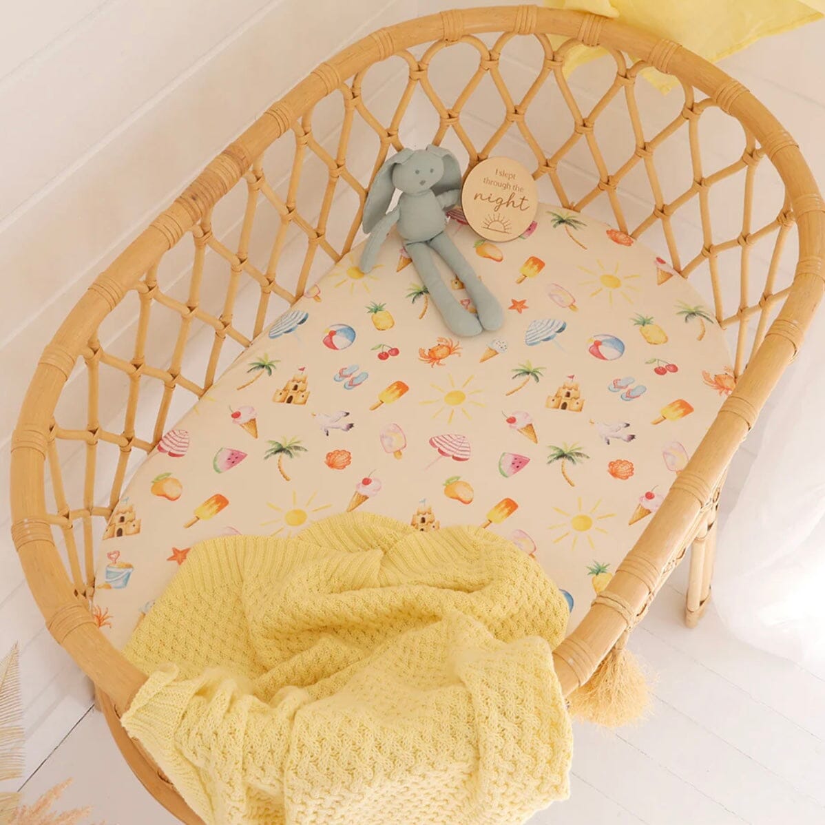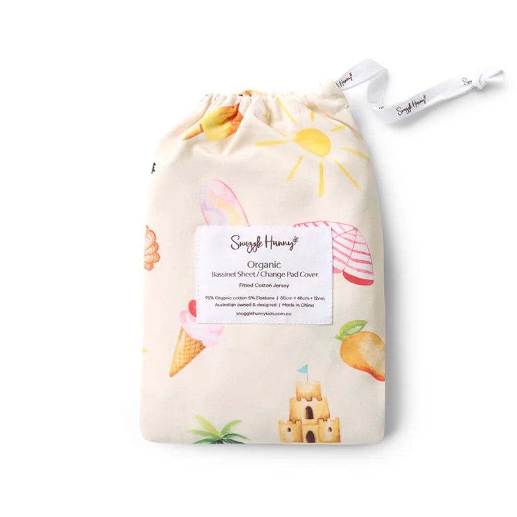 Snuggle Hunny Beach Fun Fitted Bassinet Sheet doubles as a Change Pad Cover and is made from snuggly soft organic stretch cotton jersey. It is stretchy so fits most bassinet mattress sizes and comes in a matching drawstring bag.