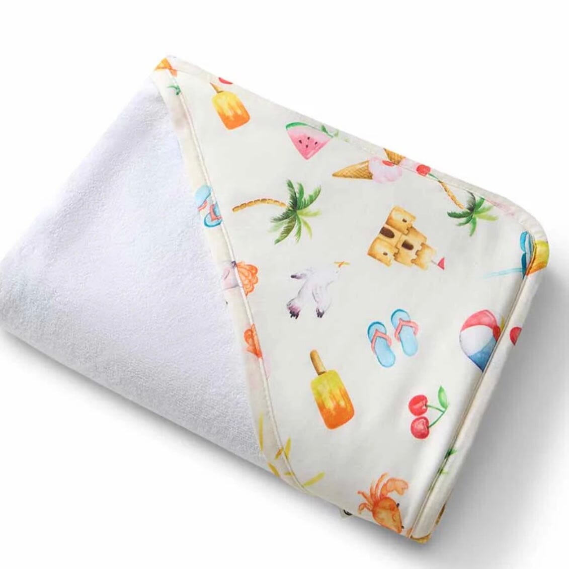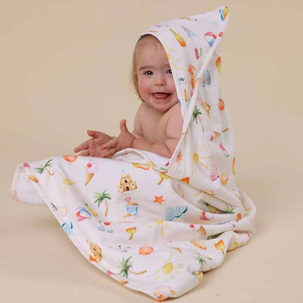 This beautiful extra large organic baby towel in Beach Fun is the perfect size for babies and toddlers and will brighten up any bathroom.