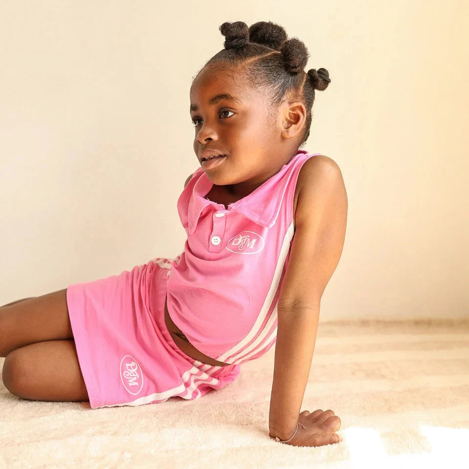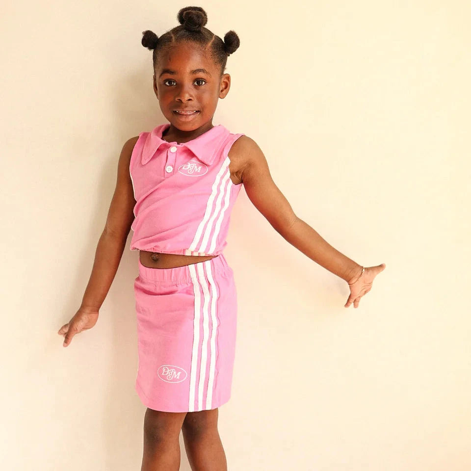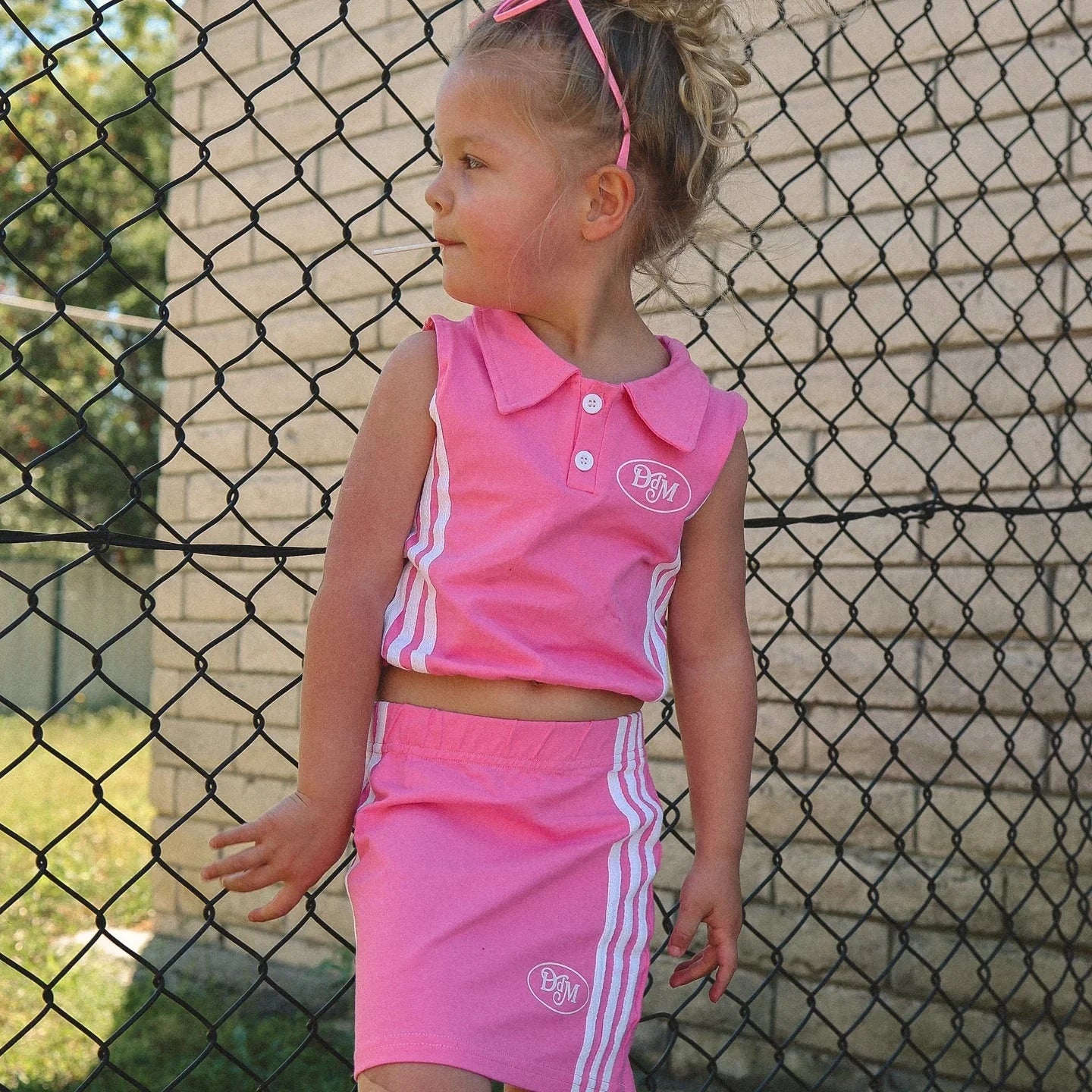 Our Court Set brings all the 90s tennis club energy โ a sleeveless top paired with a matching skirt made for twirls, chaos, and court-side cuteness.