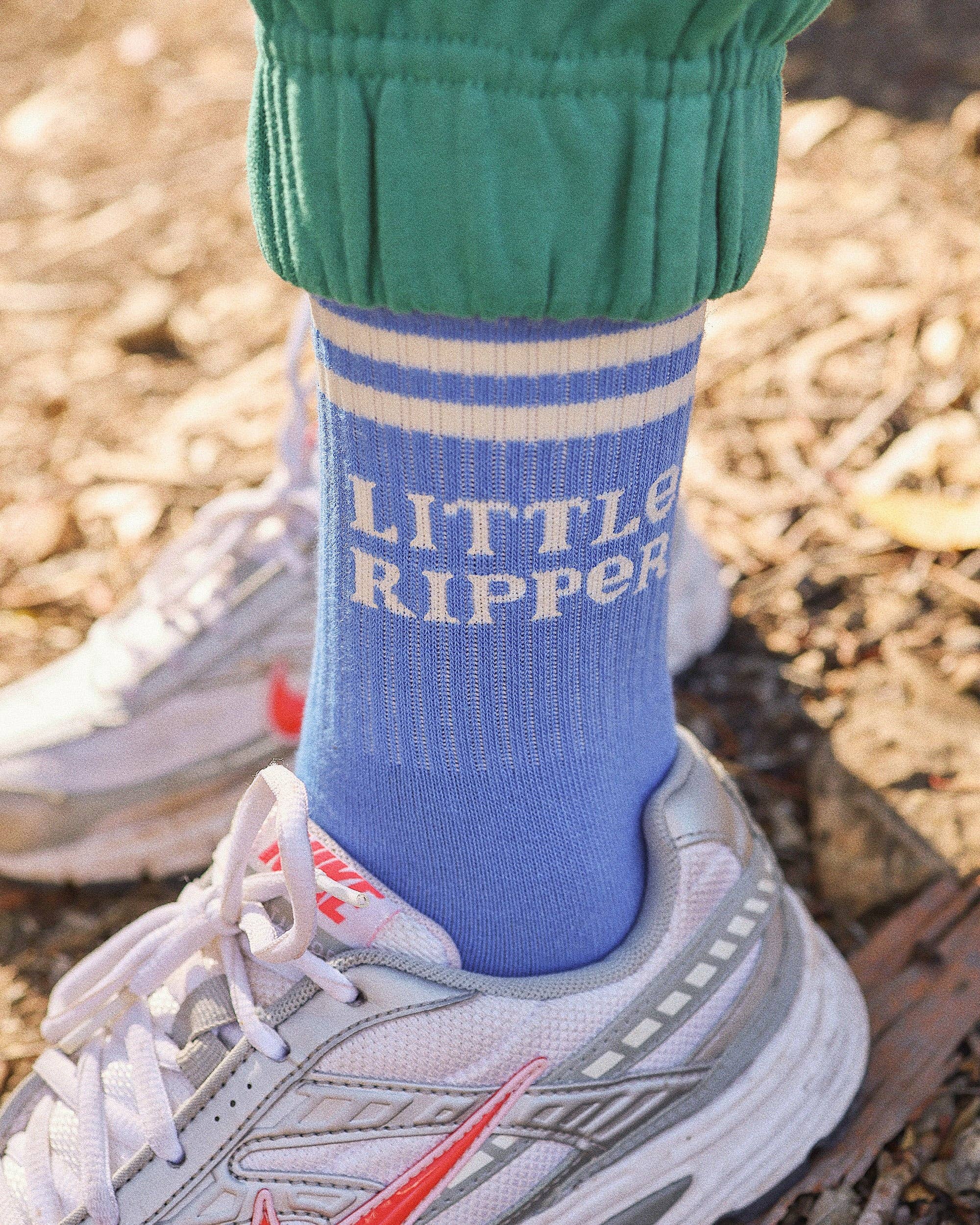 Little legends need socks to match, and the Kids Little Ripper Socks in Blue are just the ticket. With bold colour, retro stripes and a playful Aussie slang knitted right into em', they’ll keep mini feet feeling fresh and looking ace all day long.