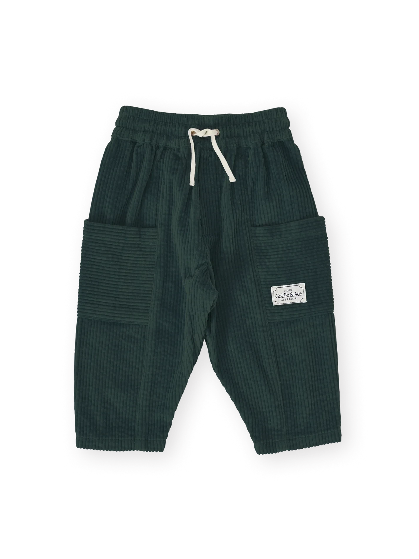 Moss green corduroy pants with an easy elastic waist and pockets for all sorts of treasures - a Goldie + Ace favourite that moves as fast as they do.