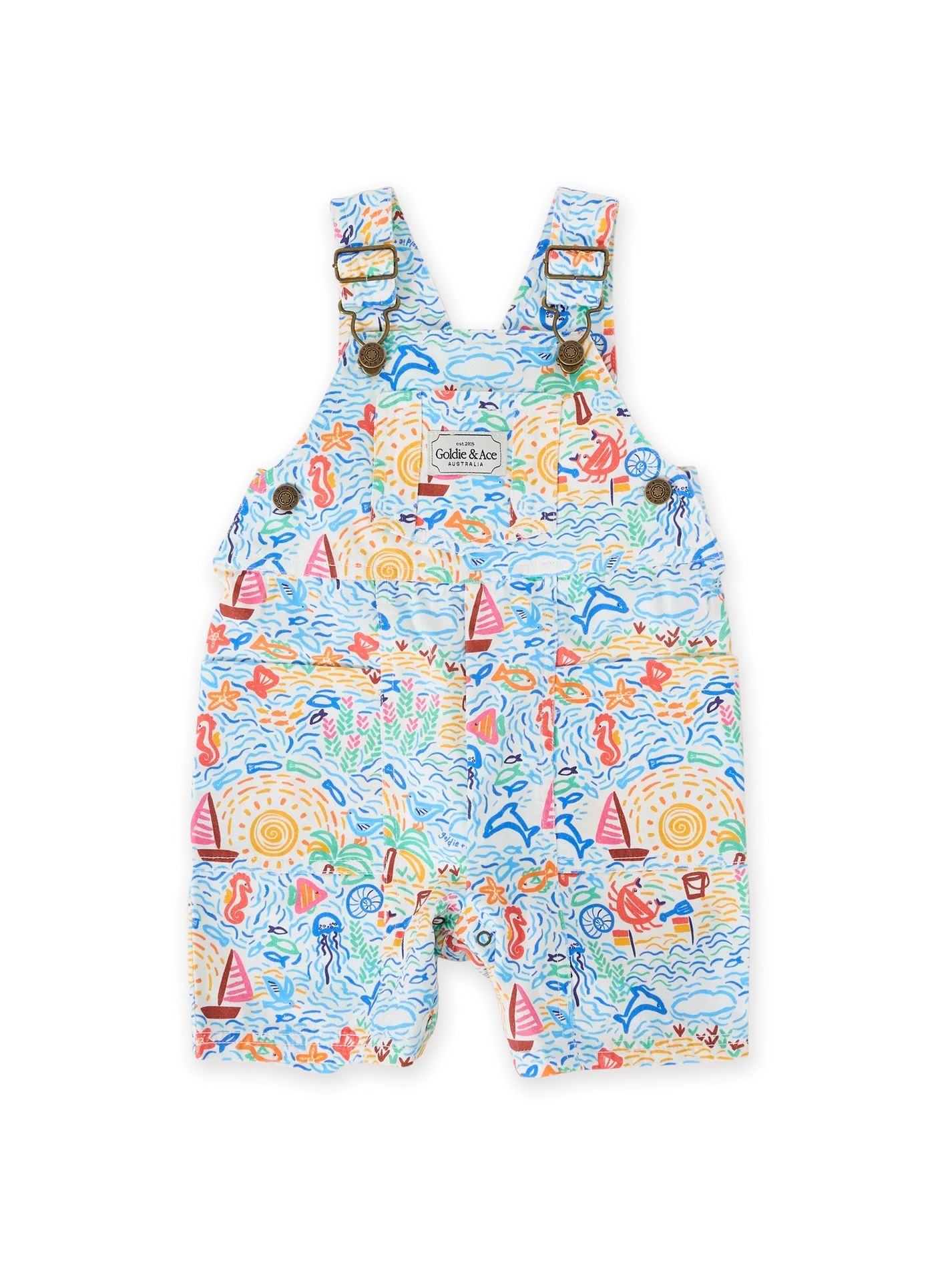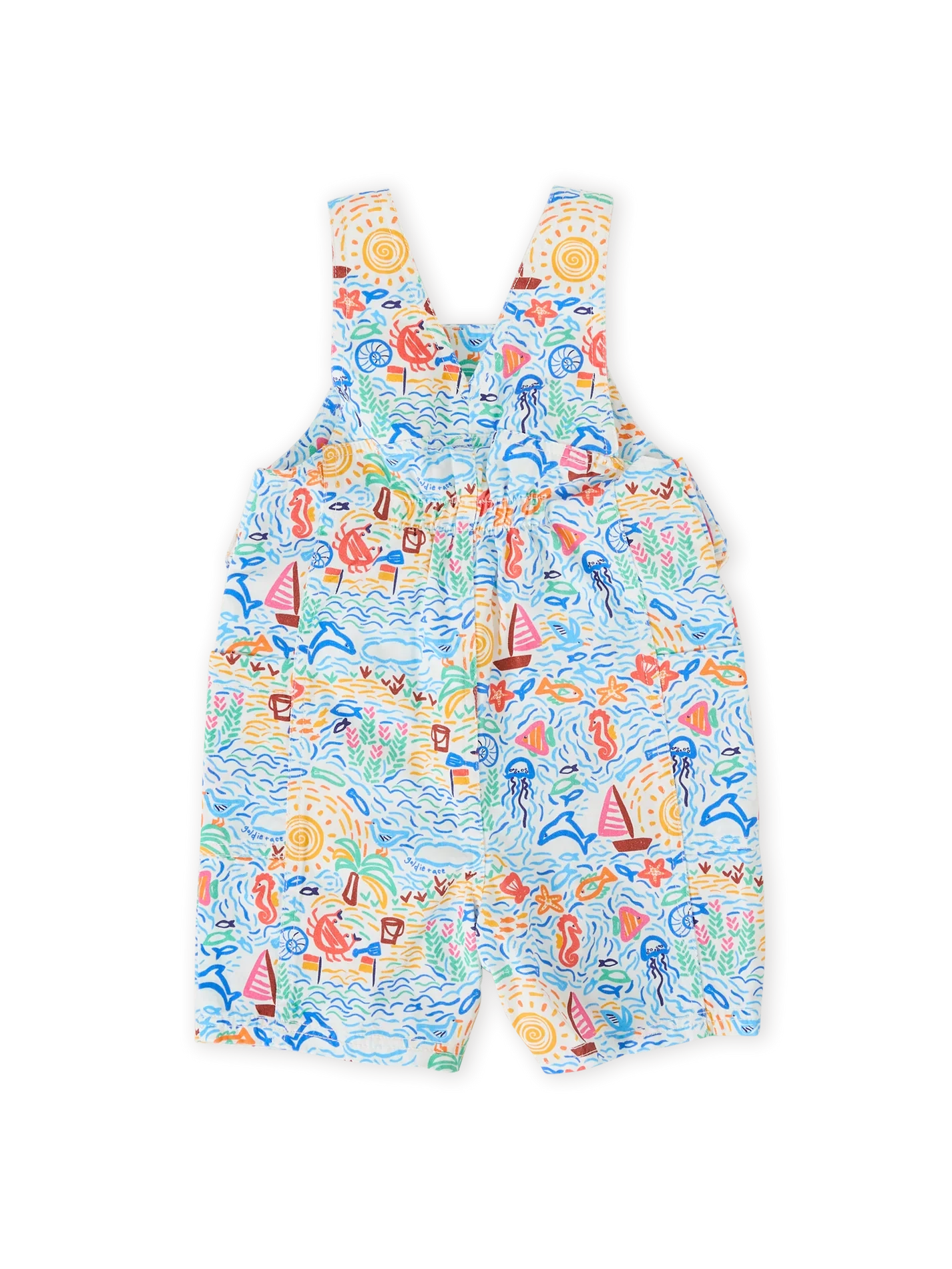 A new shortall style with a seaside spirit. Soft-but-sturdy cotton twill makes the colourful print pop, plus snack-sized pockets, and a front pouch are fit for the most "important" items of their day.