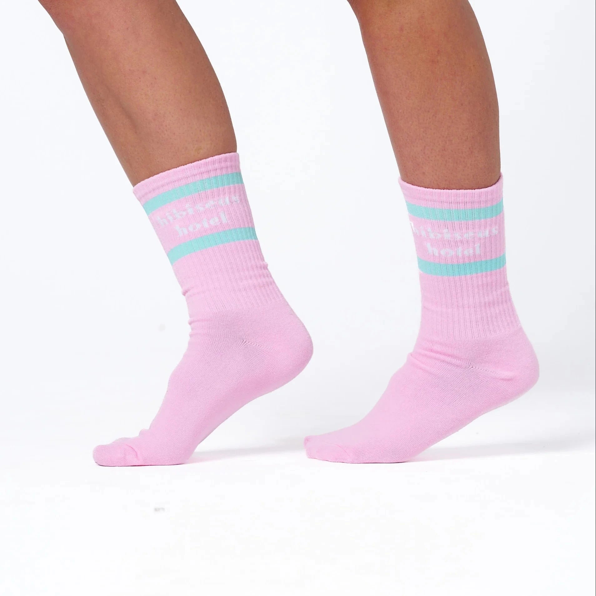 The Hibiscus Hotel Layover Sock is your boarding pass to cool-girl comfort. Pastel pink and mint retro stripes and the Hibiscus Hotel stamp, these socks bring a playful edge to sneakers, slides, or just kicking back.