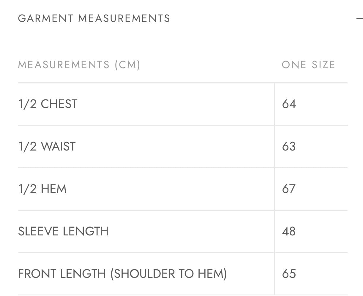 The is a One Size garment. Designed in a relaxed, boxy silhouette, the top comfortably fits sizes AUS 10-16.