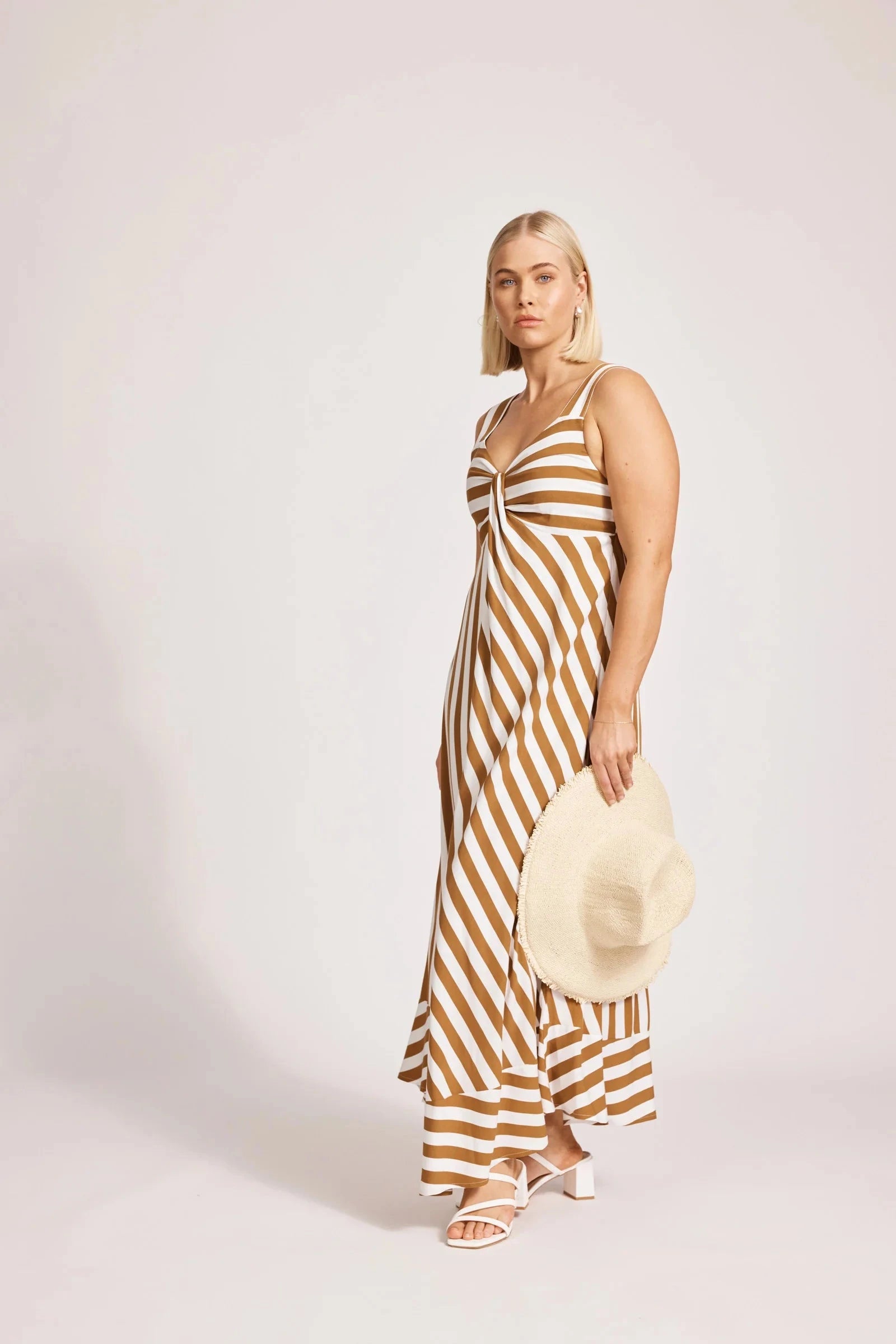 A show-stopping striped maxi. Made from soft washed rayon for effortless drape. Features a fixed tie at the chest for shape, wide shoulder straps to conceal undergarments, concealed elastic at the back for comfort, and side zip closure. Finished with a contrast stripe panel at the hem.