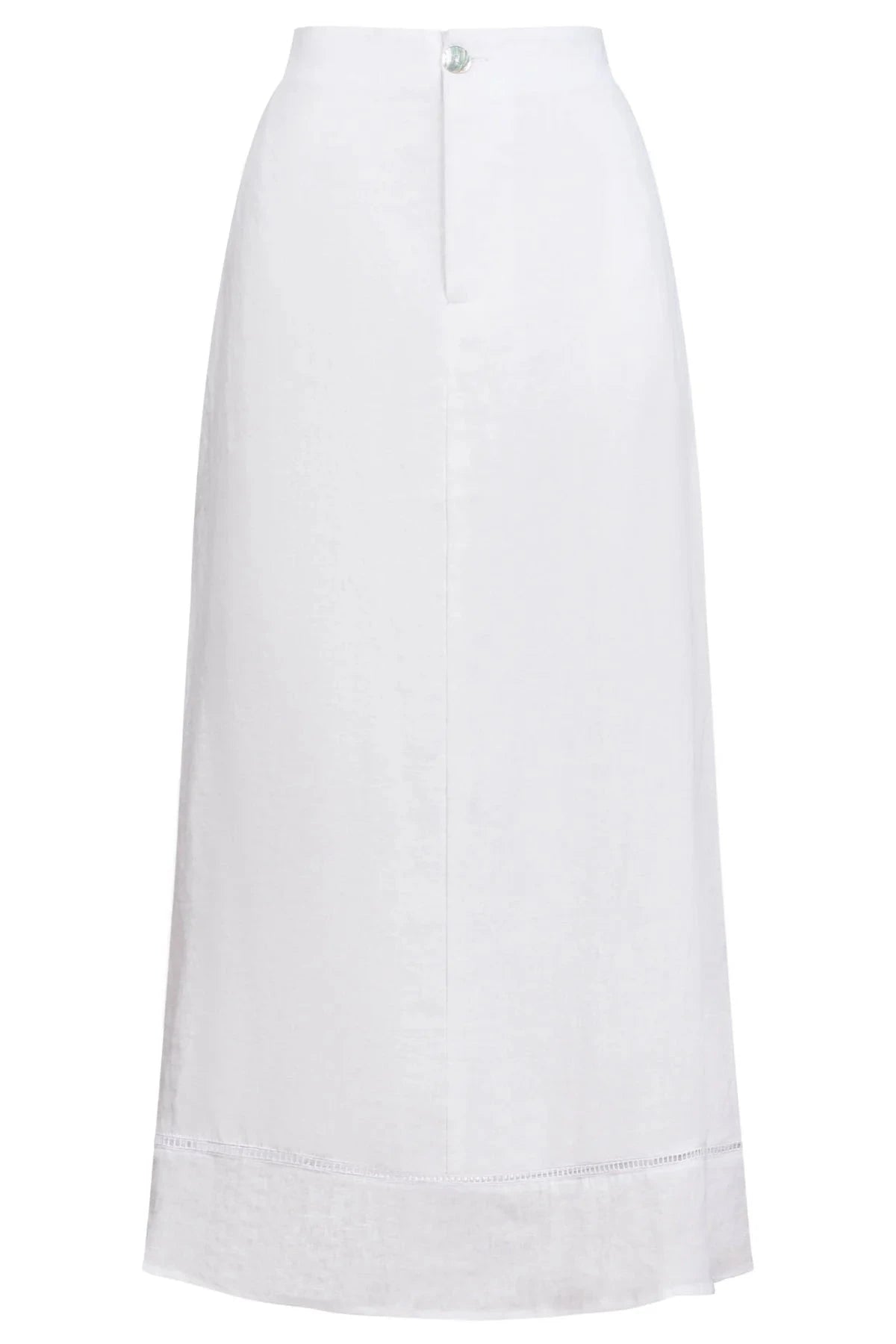 A timeless maxi skirt designed to flatter. Crafted from 100% linen with a flat front waistband and elasticated back for comfort. Features functional pockets, ladder lace trim above the hem, and an A-line silhouette.