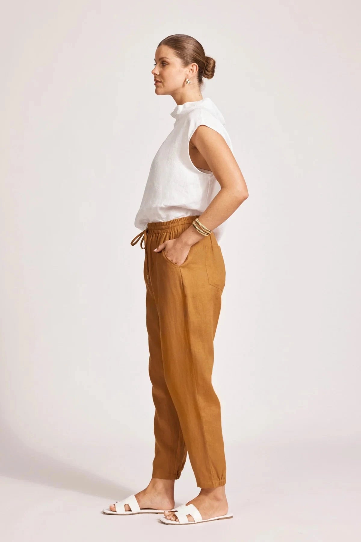 A relaxed jogger-inspired pant designed for effortless everyday style. Crafted from 100% linen for breathable comfort. Features an elasticated drawstring waist, tapered leg, and elastic at the back of the cuff. Side pockets add practicality.