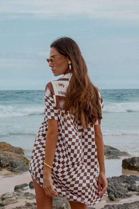 The brown palm tree shirt dress in chocolate and vanilla and white features our exclusive palma print and checkerboard print in a soft high quality thick rayon voile. Soft to touch and luxurious to wear, this modern classic boyfriend fit shirt dress features concealed buttons, and a longer hem at the back. Perfect for beach or casual Fridays.