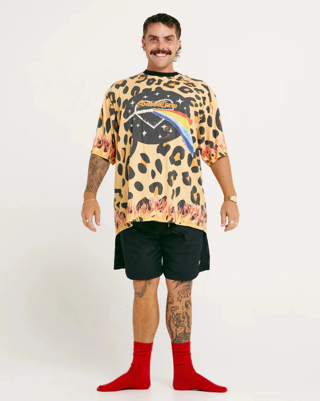 This standard cut tee drips with nostalgia: think vintage gig-poster graphics, leopard print for days, and a lick of flames because… why the hell not?