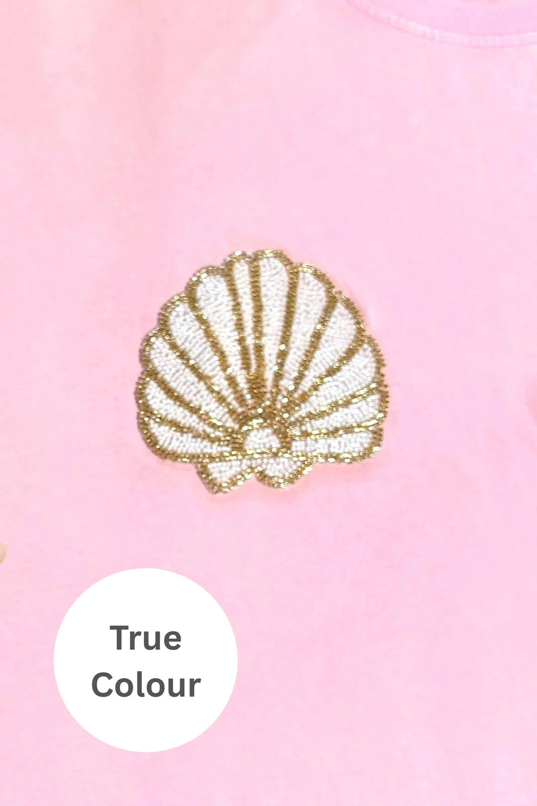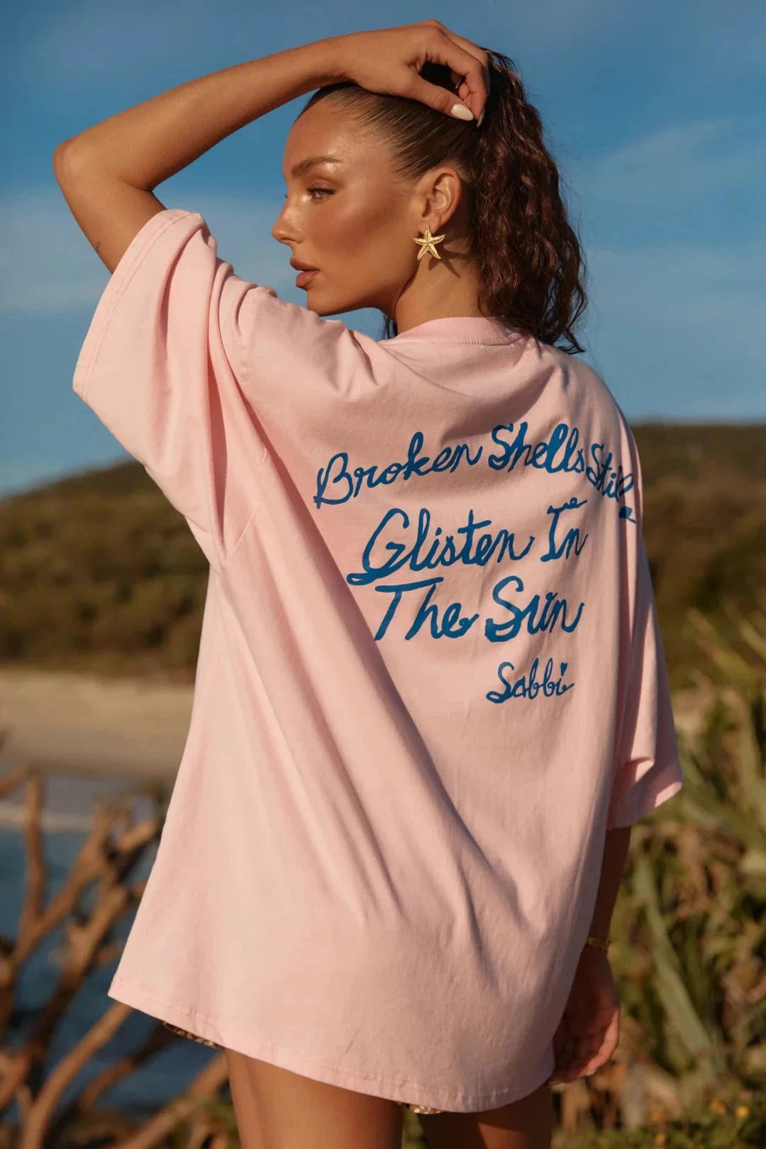 Cut in a very oversized, slouchy fit, this tee features sparkling shell embroidered artwork on the front and statement Broken Shells Still Glisten In The Sun wording across the back. Effortless, playful and designed to shimmer just like you do. ✨
